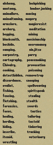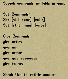 Test Center Shard (Test Center 1) 其實是主要用來給玩家們試技能,BUG及新patch來臨之測試。在這裡大家角色可以無所不能,但仍有700skill或三圍上限限制,但作為測試用主機已是很好了。 開角色後大家會有 1 million gold, silver ,Full Spell Book , 藥材Regs,資源 (hides, ore, cloth, wood, etc.),也有回饋座騎或特別道具等。 **但注意Test Center是會每隔新patch便刪除舊Test Center的資料,所以大家不要在這落地生根。 ![]() 指令篇 (設定三圍及技能) 設定三圍Stats: set str/int/dex 100 (可以是 0 - 100) 例子: set str 100 設定技能Skill: set xxxxxxx(skillname) 1200 (可以是 0 - 1200,1200等於該技能120) 例子: set archery 1000 求助: 當你打指令時忘記技能 skill name 名,可打 help skills,這樣便會在畫面上出現skill name 的資料了 **留意你的三圍及技能圖的上升/下降/鎖定狀態** help skills ( 查詢 set skill 之名稱): ![]() ![]() 指令篇 (設定物品) give arties (全系列Rare arties物品 ,例如doom, MAF,TAF) give armour (全系列Armor Set) give resources (全系列素材) give tokens (全系列禮物tokens,包括7,8,9週年) 輸入以上指令,物品便會出現你的Bank保險箱裡。 求助: 當你打指令時忘記test center的指令時,可打 help commands,這樣便會在畫面上出現所有可用指令的資料了 ![]() |